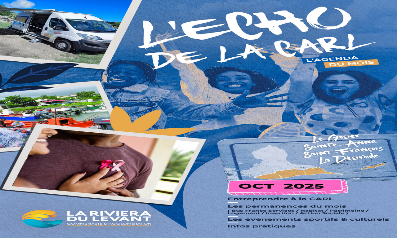 - Permanences France active & CARL : accompagnement des associations du territoire, le 28 octobre au Gosier (Médiathèque Raoul George) et le 30 octobre à Saint-François (Salle multimédia) - inscription par mail à entreprendre@rivieradulevant.fr