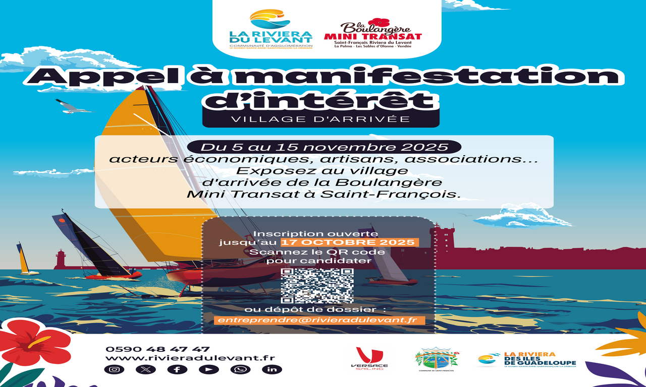 Pour animer le Villade d'arrivée à Saint-François et mettre en valeur notre territoire, la Communauté d’Agglomération La Riviera du Levant invite les artisans, entrepreneurs ou membres d’une association, à participer au Village d’Arrivée de la Boulangère Mini-Transat.